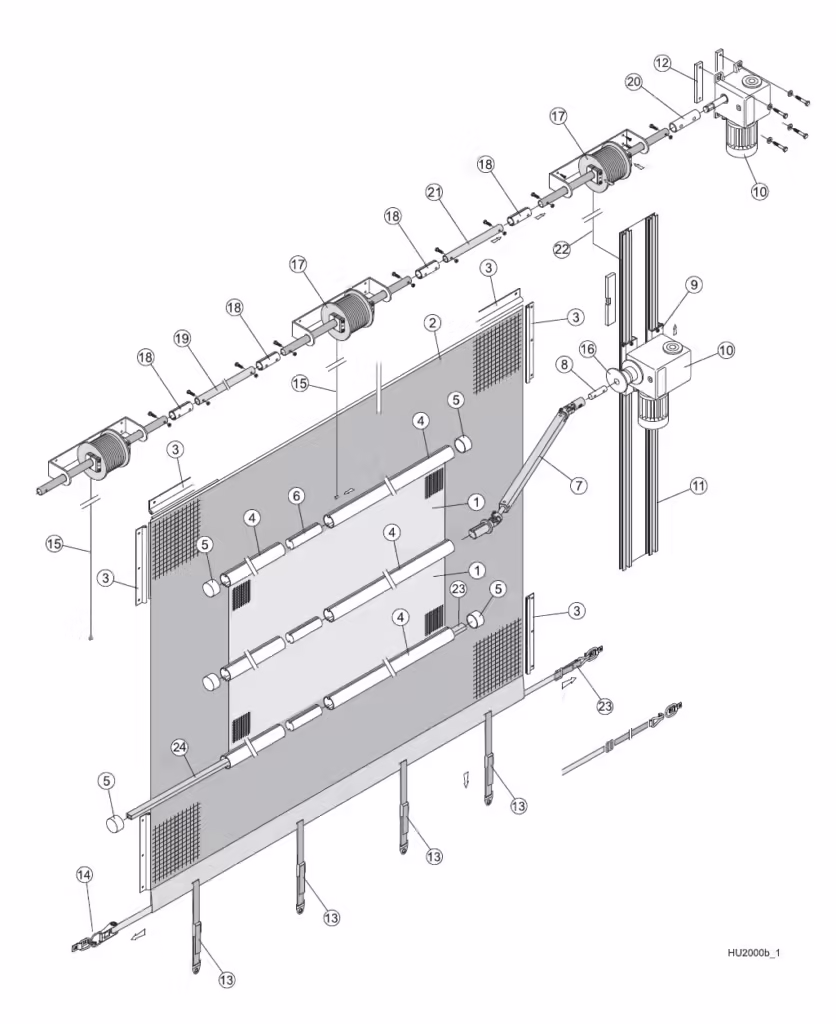 Tüm hareketli Sistemler için HUIMA 5 RPM ve 600 Nm torklu motorlar kullanılmaktadır. Bilgisayar ve uzaktan kumanda ile otomatik veya manuel olarak kontrol edilebilir. Motorlar tek ve çift kollu modelleri ile 120 metreye kadar patentli ve hafif perde sistemlerini hareket ettirmek için yeterlidir. Chain-driven sistemi son derece dayanıklı B12 zinciridir ve 18 yıldan daha uzun süredir kullanılmaktadır.